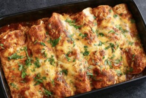 Miękkie tortille wypełnione są wyrazistym farszem inspirowanym kuchnią meksykańską – pełnym soczystego mięsa, warzyw i rozgrzewających przypraw. Całość zapiekana jest do momentu, aż smaki idealnie się połączą, a wierzch apetycznie się zrumieni.
