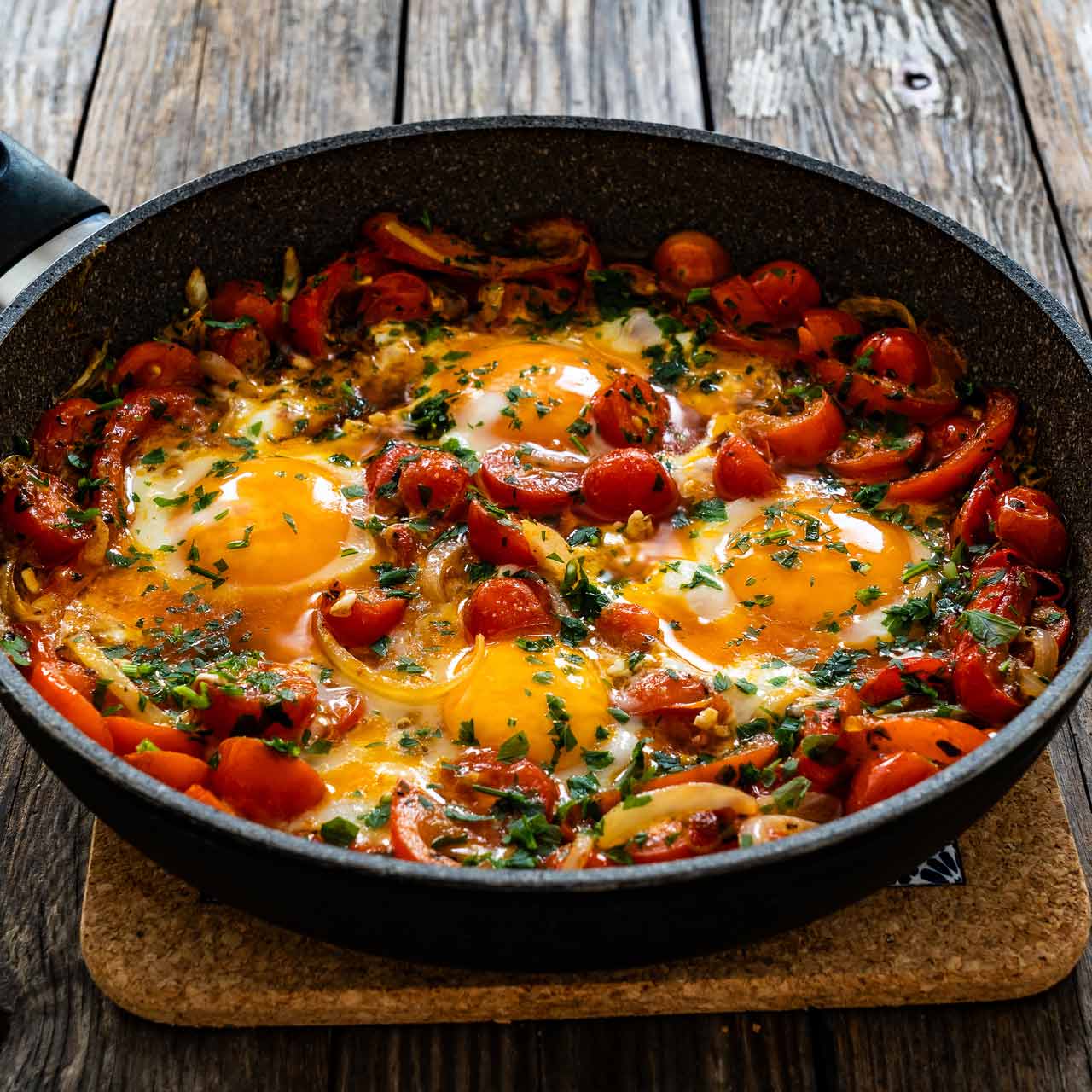 Szakszuka to potrawa wywodząca się z kuchni Bliskiego Wschodu i Afryki Północnej, która zyskała międzynarodowe uznanie dzięki swojej prostocie i wyrazistemu smakowi. To rodzaj śniadaniowego dania jednogarnkowego, w którym jajka gotowane są bezpośrednio w intensywnym, przyprawionym sosie pomidorowym z dodatkiem warzyw. W tej wersji klasyczne pomidory zastąpiono koktajlowymi – podczas duszenia wydobywają one słodko-kwaśny smak i zachowują przyjemną jędrność. Czerwona papryka i cebula wnoszą głębię aromatu oraz delikatną chrupkość. Całość dopełnia świeża natka pietruszki, która dodaje lekkości i świeżości. Najlepiej podawać szakszukę od razu po przygotowaniu, gdy jest gorąca – w towarzystwie chrupiącego pieczywa, np. bagietki, chleba na zakwasie lub