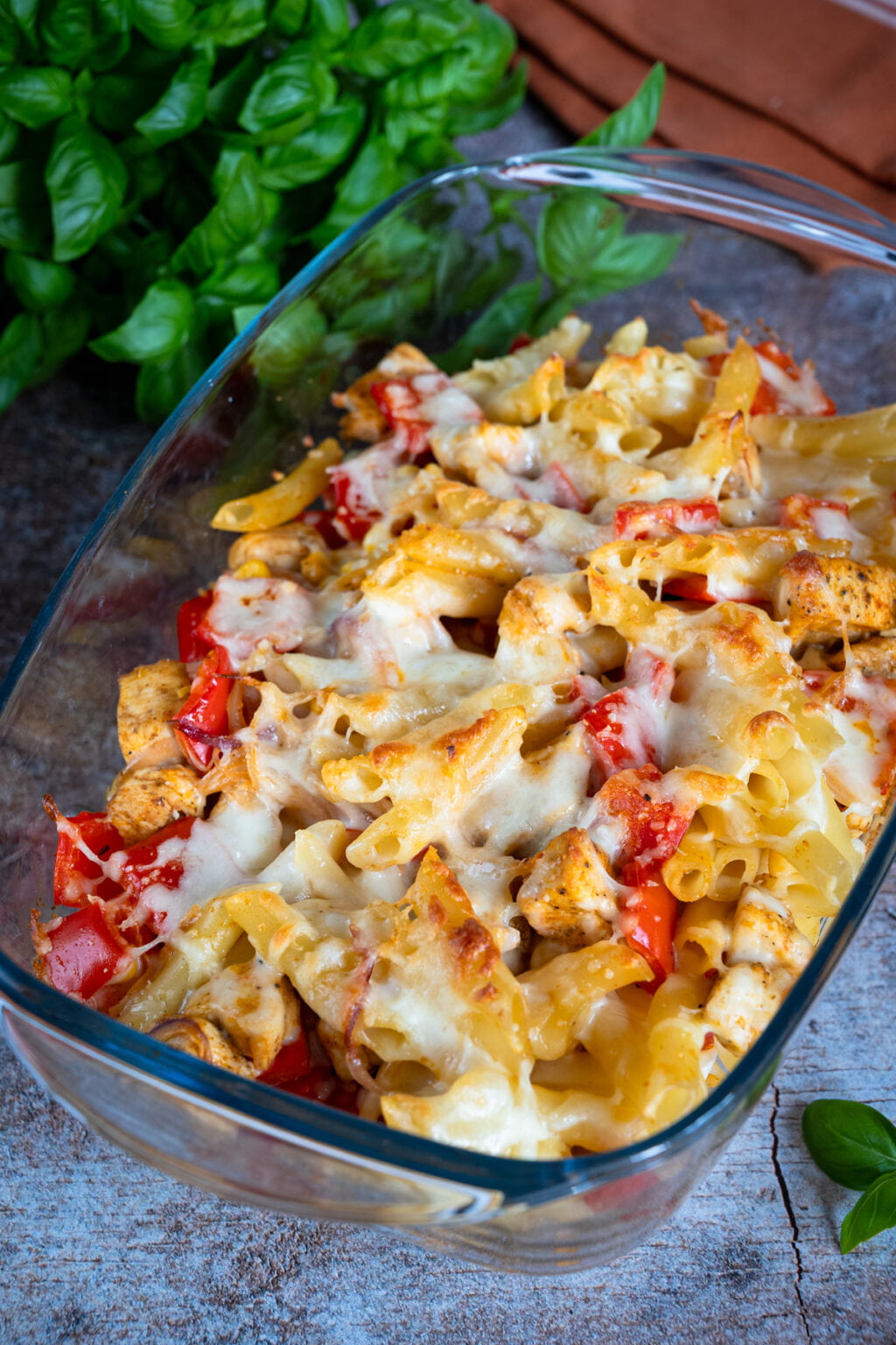 Lubię planować obiady z wyprzedzeniem, jednak zdarzają się i takie dni, kiedy otwieram lodówkę i dopiero wtedy zastanawiam się: „Co dziś zrobić na obiad?”. Właśnie wtedy najczęściej powstają u mnie różnego rodzaju zapiekanki. Tym razem postawiłam na makaron, kawałki kurczaka, paprykę i trochę sera. Lubię to połączenie. Niby nic skomplikowanego, a jednak efekt za każdym razem pozytywnie zaskakuje. Zapiekanka wychodzi pysznie i znika z talerzy w mgnieniu oka.