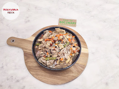Sposób przygotowania:Do garnka umieścić wątróbkę drobiową, mrożoną mieszankę warzyw oraz oczyszczone i pokrojone świeże boczniaki. Całość zalać wodą