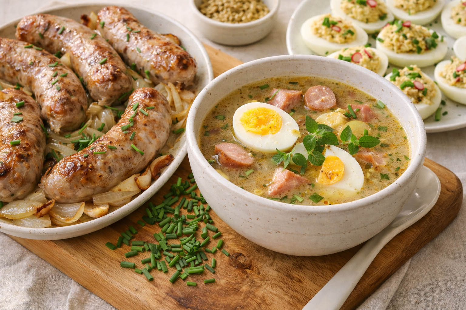 To pierwsza potrawa, po którą sięgamy przy świątecznym śniadaniu. Żurek z białą kiełbasą i jajkiem ma wyraźny, lekko kwaśny smak, który przełamuje cięższe dania. Barszcz biały jest delikatniejszy, bardziej kremowy.