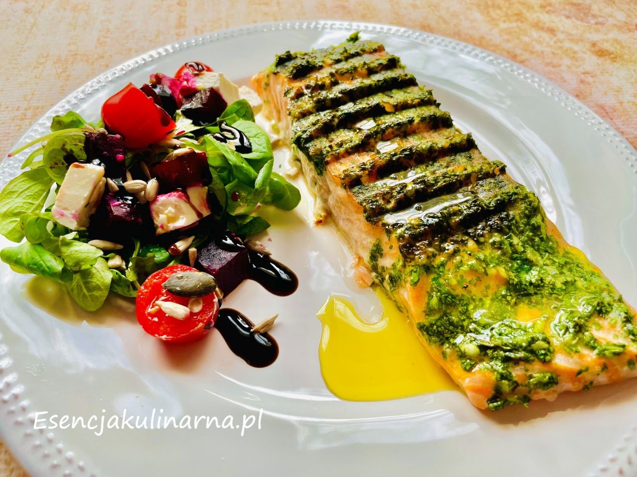 Soczysty grillowany łosoś w marynacie pietruszkowo – czosnkowej. Do tego sałatka z roszponki, fety i parowanych buraków.