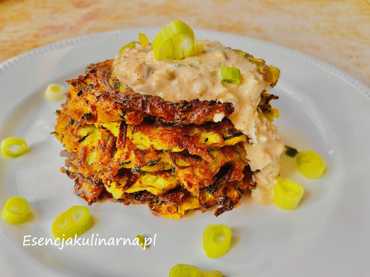 Placki z cukinii z pysznym sosem (nie rezygnujcie z niego!) na bazie majonezu, ogórków kiszonych, szczypiorku i ostrego sosu sriracha. Jeśli nie posiadacie takiego sosu, można zamienić innym ostrym.