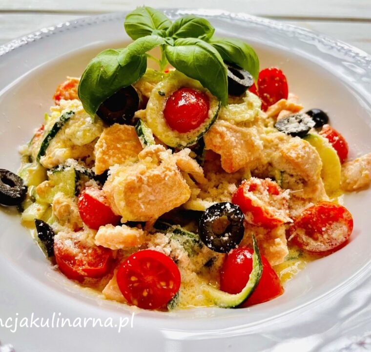 Pyszny makaron z cukinii z łososiem, pomidorkami koktajlowymi i oliwkami – całość w pysznym śmietanowo – serowym sosie.