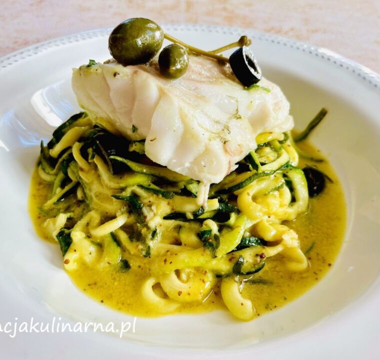Pyszne i szybkie danie, które wykonasz na jednej patelni. Soczysty dorsz, makaron z cukinii i słodko – kwaśny sos musztardowy. Będzie Ci potrzebna tarka spiralna (spiralizer) do cukinii.