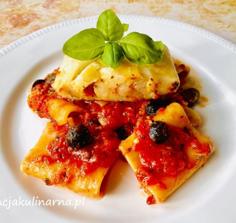 Pyszne i szybkie w przygotowaniu danie. Dorsz podsmażany na masełku, do tego sos ze słodkich pomidorów i czarnych oliwek a całość podawana na pysznym makaronie..