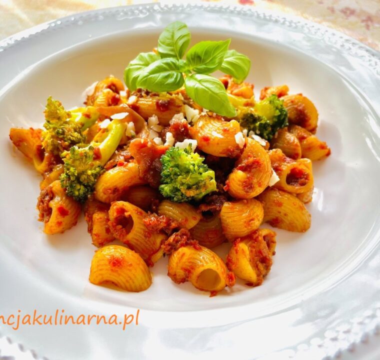 Pyszny i szybki w przygotowaniu makaron z pesto z suszonych pomidorów. Do tego aromatyczne dodatki – czosnek, oliwa, brokuły i szynka parmeńska.