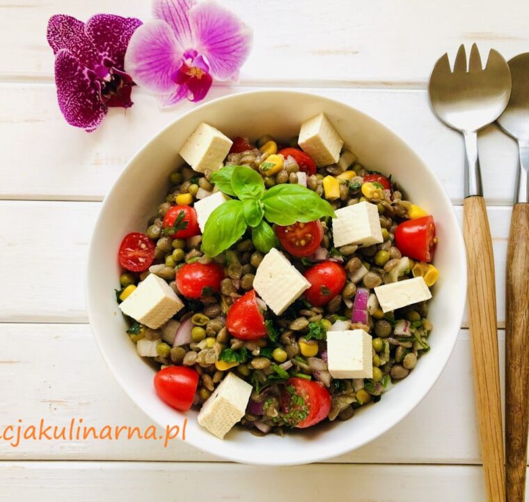 Pyszna sałatka z soczewicy z dodatkiem fety, kukurydzy, papryki, czerwonej cebuli i pomidorków koktajlowych. Całość skropiona pietruszkowo czosnkowym sosem oliwnym.