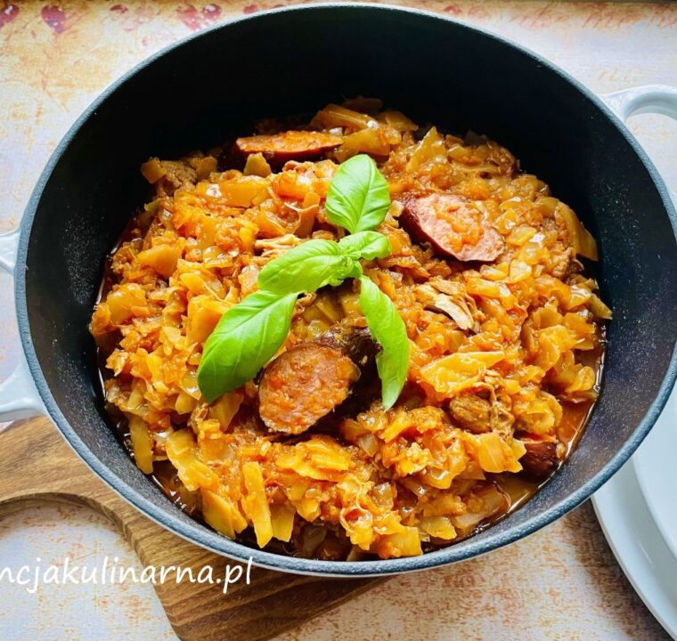 Pyszny i aromatyczny bigos z kapusty kiszonej i słodkiej, duszony na żeberkach z dodatkiem podwędzanej kiełbasy.
