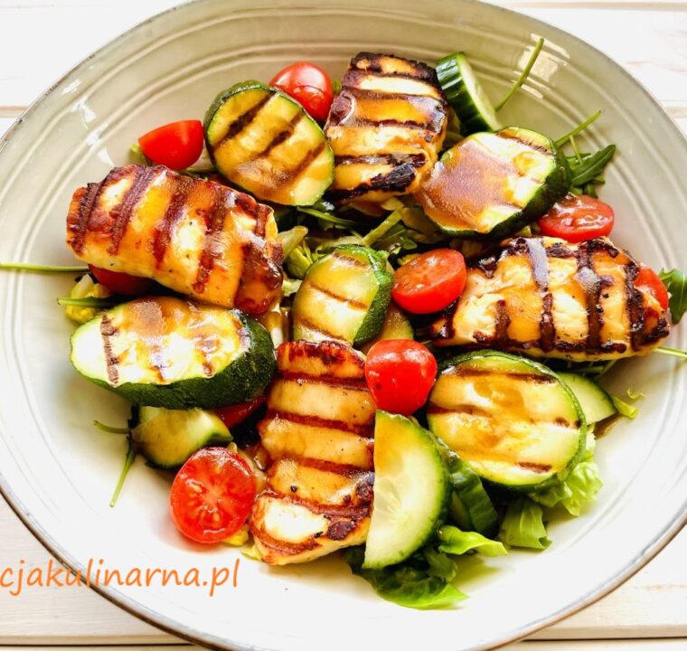 Pyszna, szybka w przygotowaniu sałatka z grillowaną cukinią i halloumi na rukoli i sałacie rzymskiej z dodatkiem pomidorków koktajlowych, ogórka – całość z dodatkiem słodko – wytrawnego sosu.