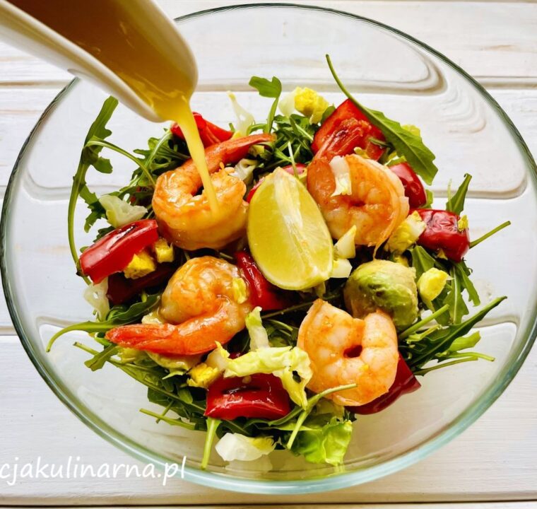 Pyszna i odświeżająca sałatka z krewetkami i grillowaną papryką. Do tego słodko kwaśny sos – limonkowo – miodowy – po prostu pycha!