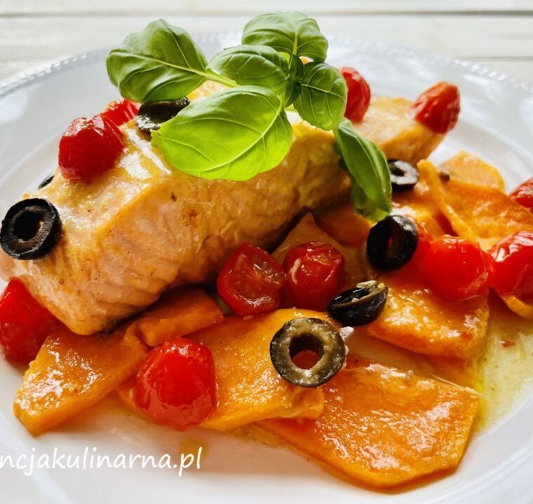 Pyszny i soczysty łosoś z batatami pomidorkami koktajlowymi i oliwkami. Do tego wyśmienita marynata – pyszne danie w 30 minut.