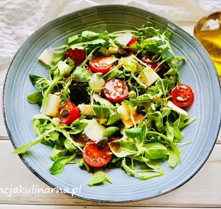 Pyszna lekka sałatka z pomidorkami koktajlowymi i grana padano. Do tego rukola i sos na bazie oliwy z oliwek, musztardy, miodu i sosu balsamicznego. Szybko i pysznie.