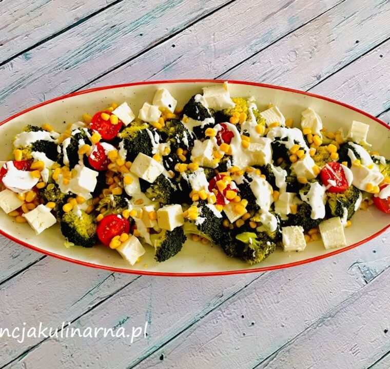 Pyszna i szybka sałatka z brokułem, fetą, kukurydzą i pomidorkami koktajlowymi w sosie czosnkowo chrzanowym.