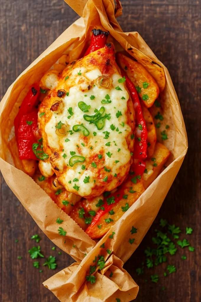Pyszny i szybki obiad: pieczony kurczak, warzywa i zioła. Całość pieczona w papilotach z papieru do pieczenia.