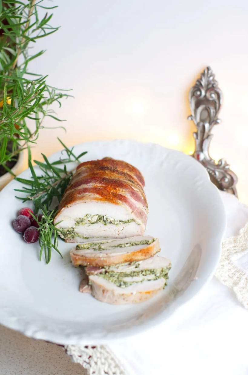 Aromatyczna rolada z kurczaka owinięta plastrami wędzonego boczku, z nadzieniem z fety i szpinaku. Pyszna przekąska zarówno na zimno do chleba, jak i na ciepło w postaci obiadu lub kolacji. Nadzienie jest arom[…]