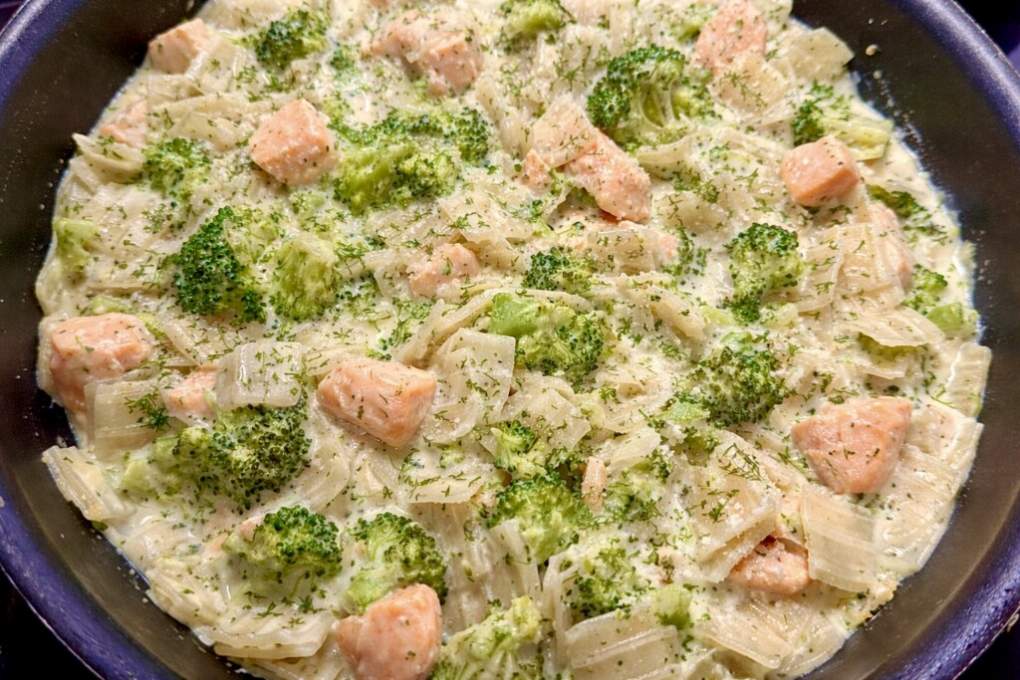 Łazanki z łososiem w sosie brokułowym