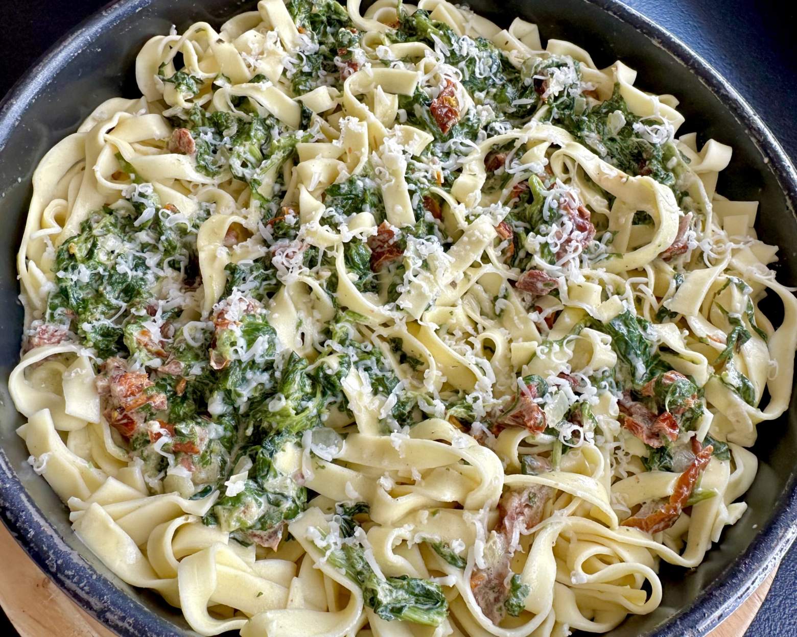 Makaron w sosie śmietanowym ze szpinakiem i suszonymi pomidorami