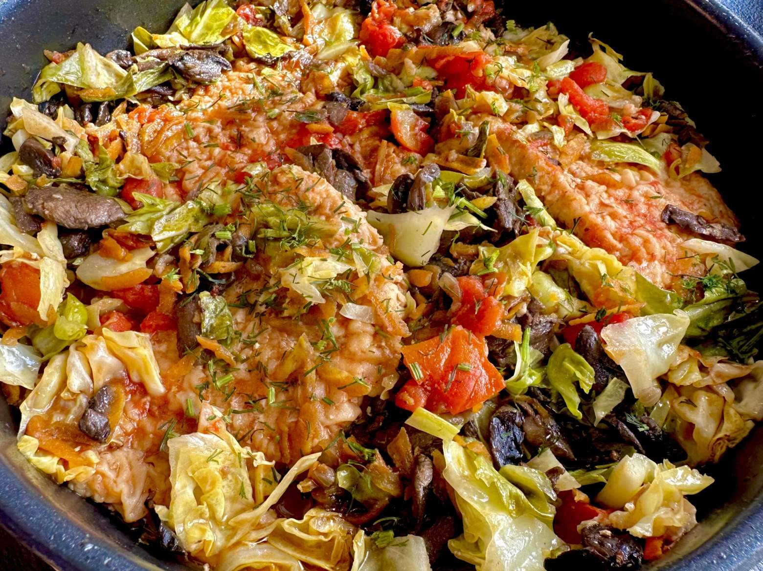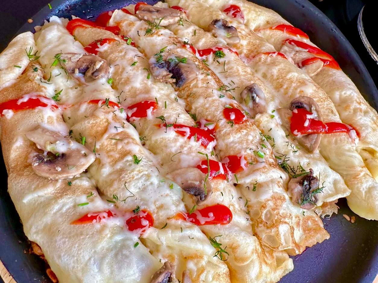 Naleśniki z patelni z młodą kapustą i pieczarkami