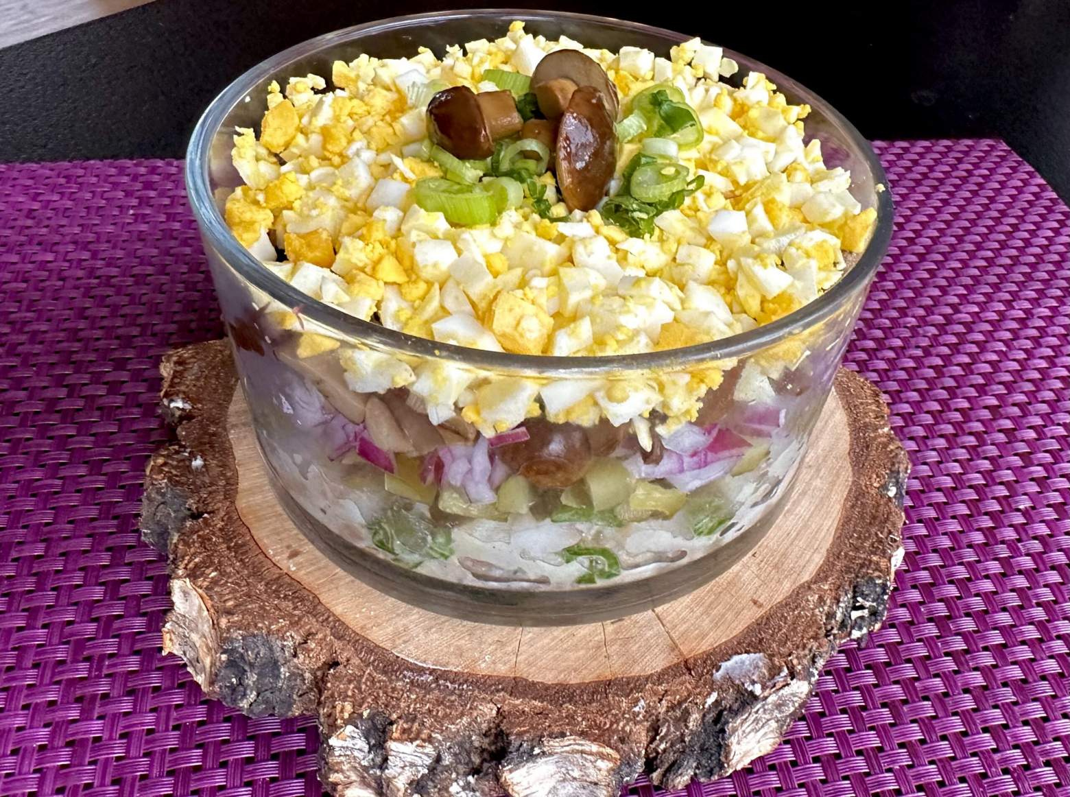 Świetna przekąska warstwowa, która sprawdzi się zarówno w wigilię jak i na przyjęciu. Wspaniale prezentuje się na stole i równie dobrze smakuje. Polecam!