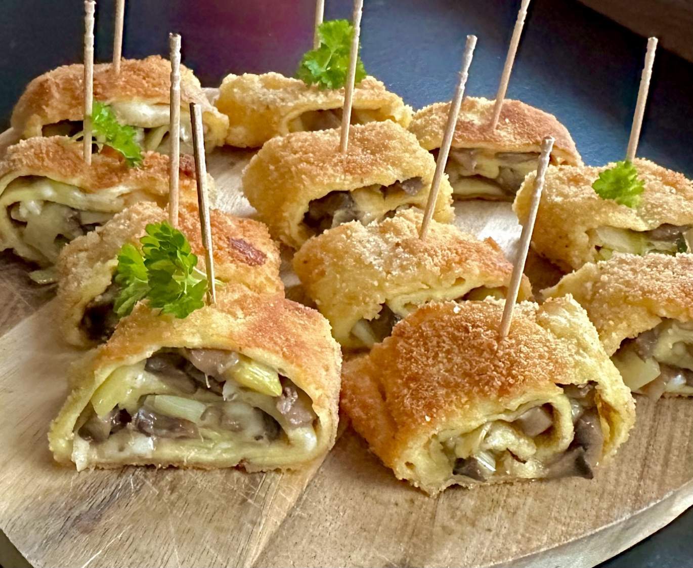 Koreczki naleśnikowe z porem, pieczarkami i żółtym serem