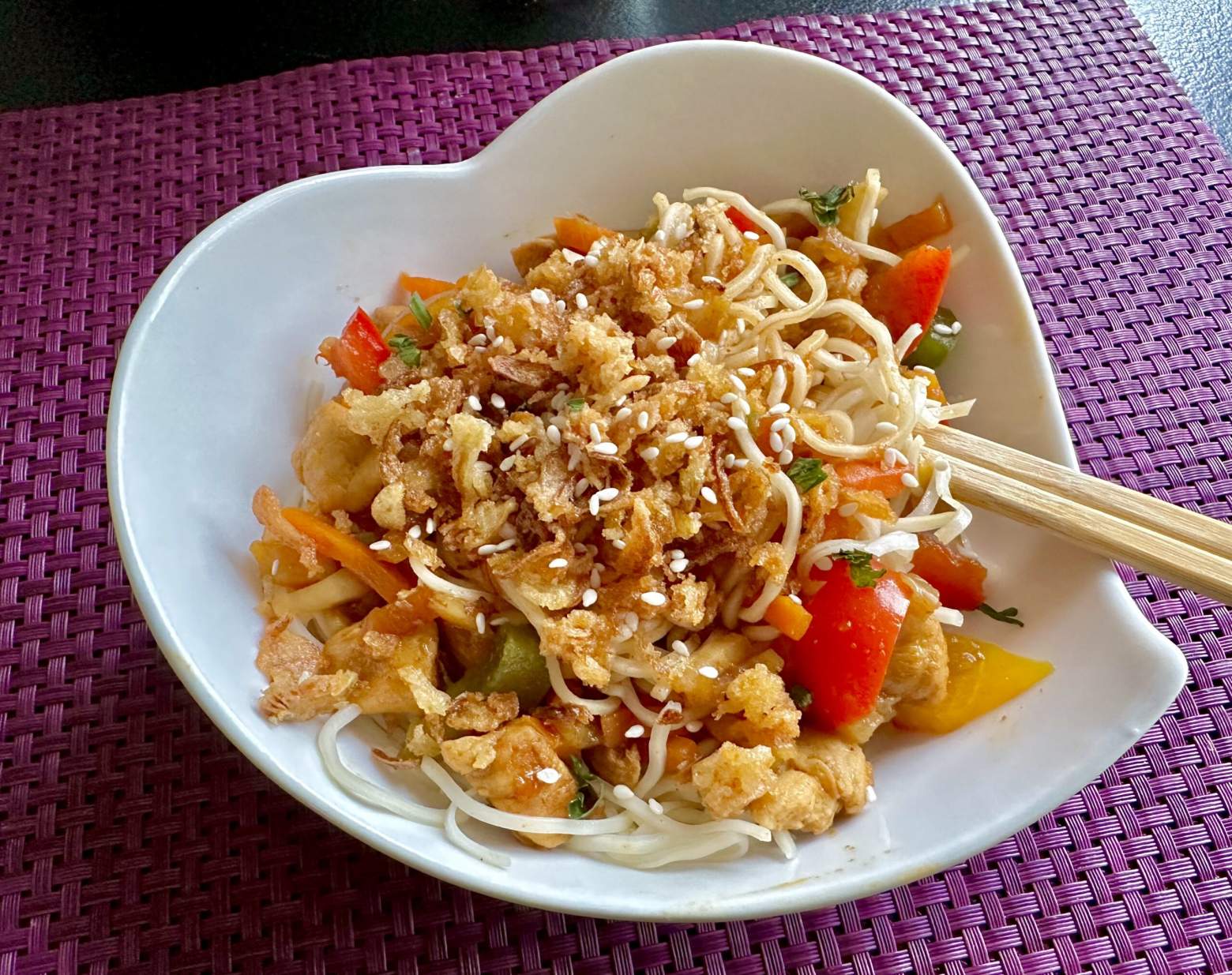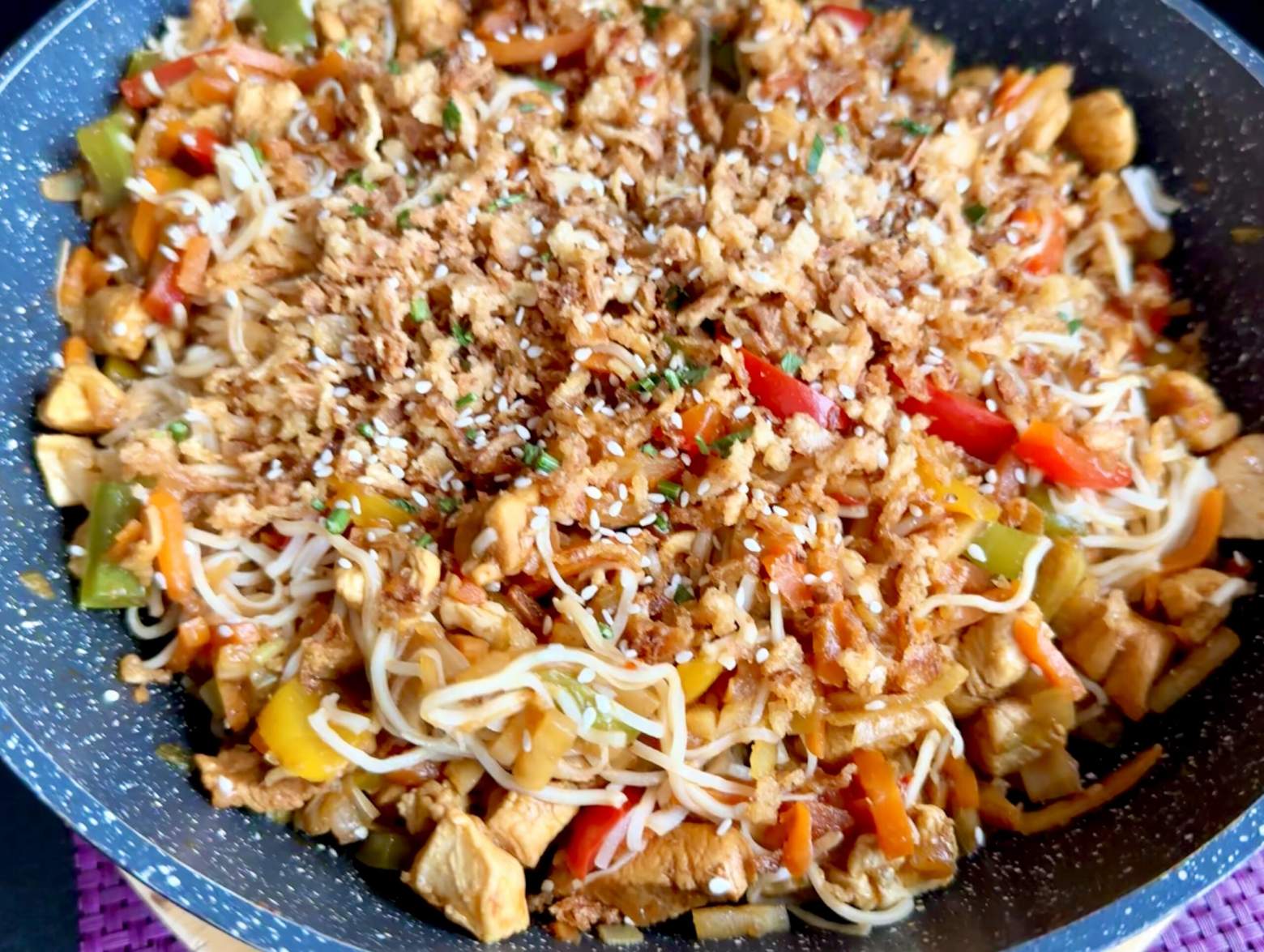 Prosty i pyszny makaron z kurczakiem w klimacie kuchni chińskiej, którego wykonania zajmuje zaledwie kilka minut.