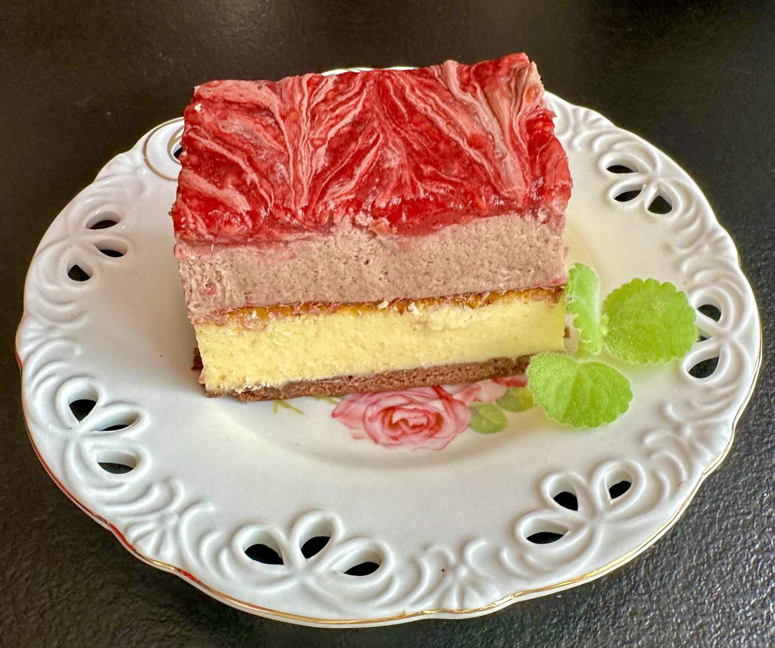 Sernik z musem czekoladowym i frużeliną malinową
