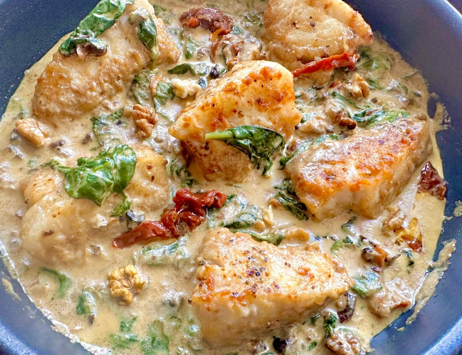 Pomysł na szybki i pyszny obiad z wykorzystaniem filetów dorsza. Soczysta i rumiana rybka w kremowym sosie śmietankowym ze szpinakiem, orzechami i suszonymi pomidorami. Danie palce liz[…]