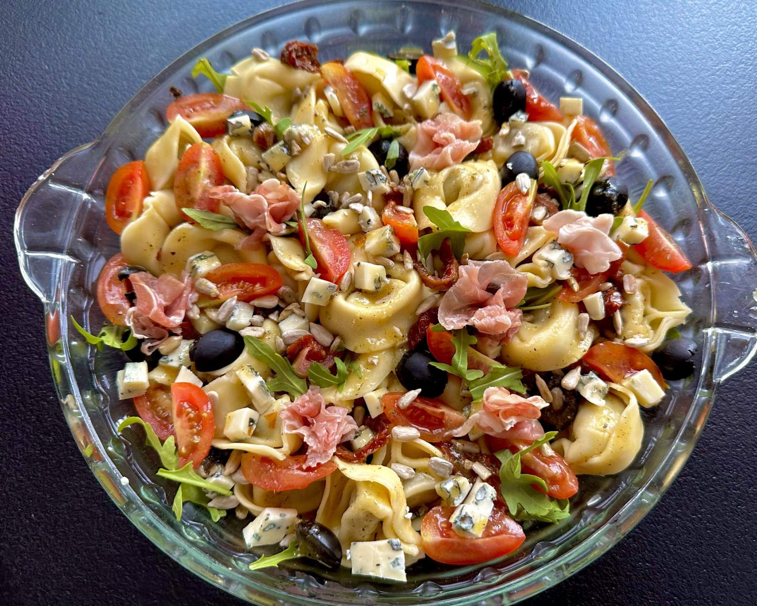 Bardzo smaczna, lekka, a za razem treściwa sałatka z pierożkami tortellini i pysznym dresingiem. Polecam!