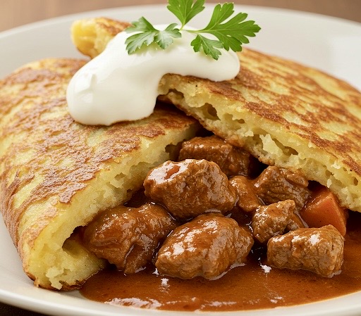 Sycące i niezwykle aromatyczne danie, które łączy w sobie chrupkość złocistych placków ziemniaczanych z bogactwem smaku duszonego mięsa oraz delikatnością kwaśnej śmietany. Placki po zbó[…]