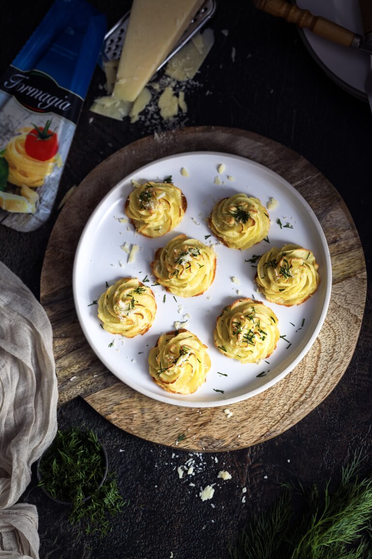 Ziemniaki księżnej, czyli zapiekane ziemniaczane rozetki z serem dojrzewający typu parmezan.