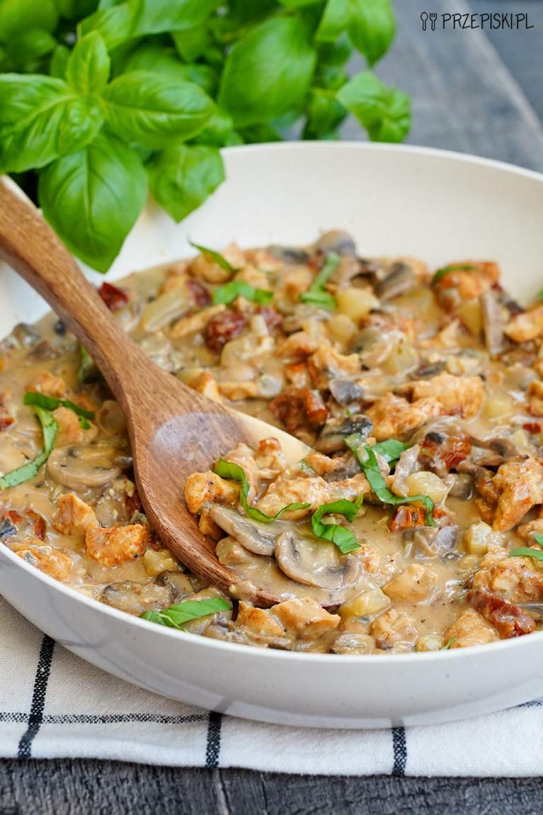 Kremowy kurczak w sosie z pieczarkami, gruszką i suszonymi pomidorami. Prosty i szybki przepis na pyszny obiad z gorgonzolą, gotowy w mniej niż 30 minut!