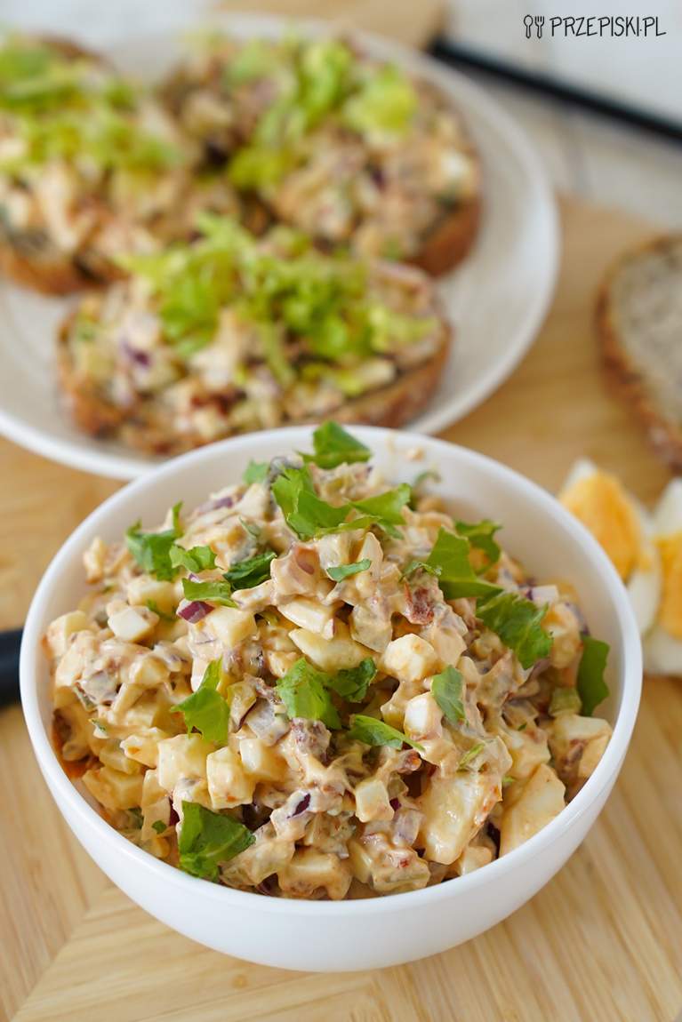 Kremowa pasta kanapkowa z jajek, suszonych pomidorów, cebuli i ogórków konserwowych. Idealna na śniadanie, kanapki oraz jako baza do przekąsek. Prosta i szybka w przygotowaniu!