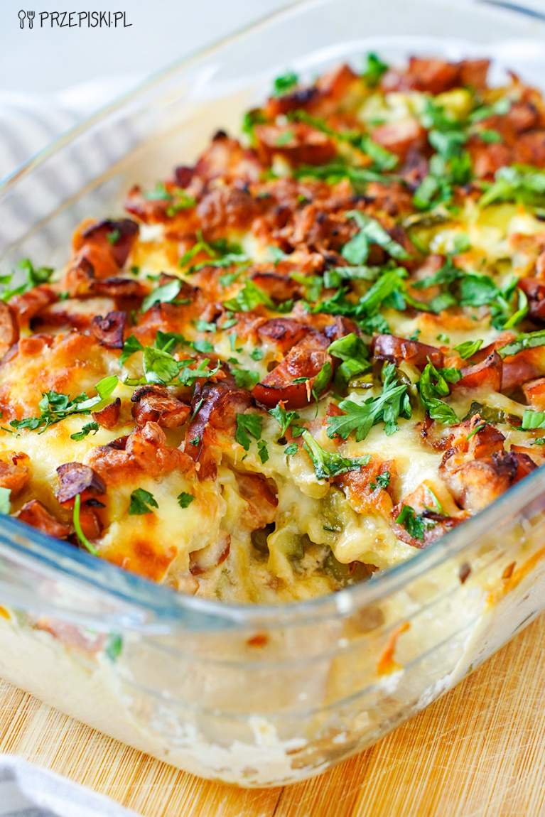 Przepis na pyszną zapiekankę obiadową z ziemniaków i kiełbasy. Idealny pomysł na pyszny, prosty i szybki obiad!