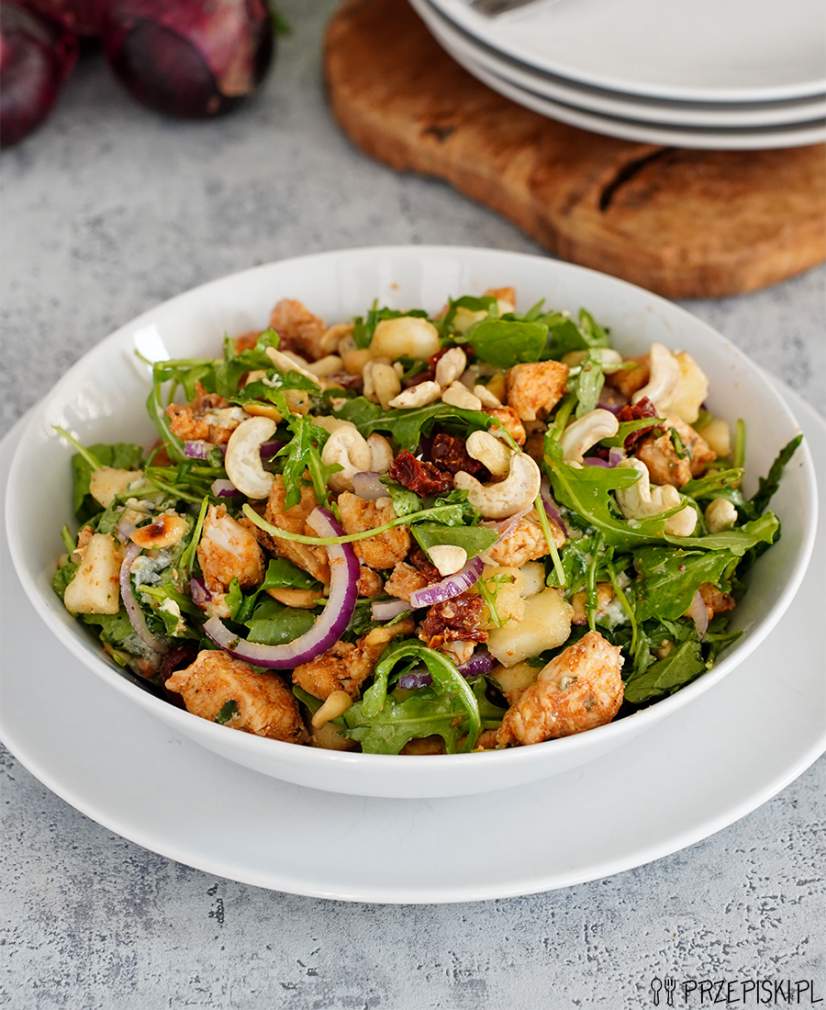 Pyszna sałatka z rukolą, suszonymi pomidorami i kurczakiem, która doskonale sprawdzi się na lekki obiad, kolację czy na spotkanie ze znajomymi.