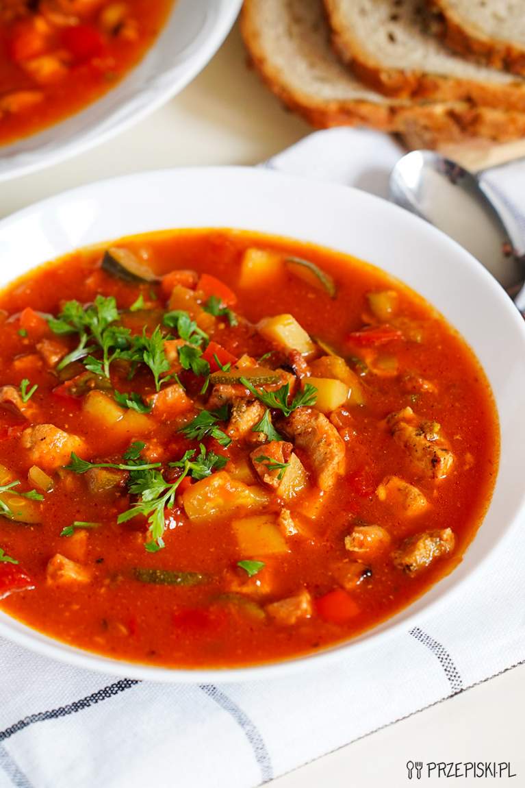 Smaczna i sycąca zupa pomidorowa z kurczakiem, kiełbasą i warzywami. Pyszny, domowy przepis na sycący obiad jednogarnkowy z ziemniakami, cukinią, papryką i aromatycznymi ziołami.