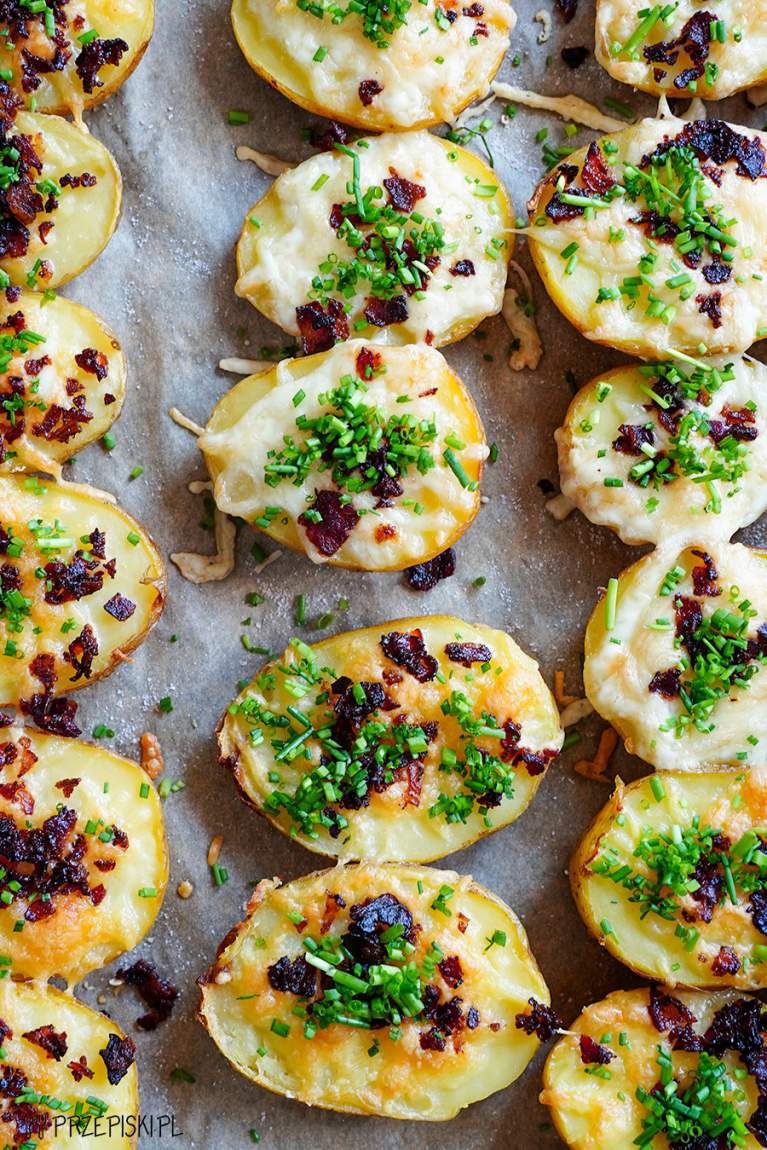 Chrupiące pieczone ziemniaki z serem cheddar i boczkiem. Super prosty przepis na pyszną przekąskę lub dodatek do obiadu.