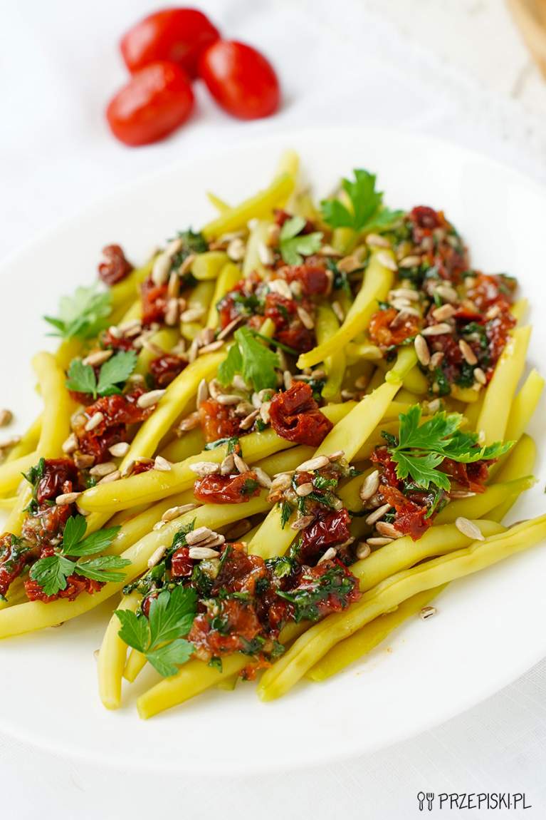 Przepis na fasolkę szparagową z suszonymi pomidorami i prażonym słonecznikiem w nowoczesnym wydaniu. Szybka, zdrowa i aromatyczna przekąska, idealna do obiadu, jak i samodzielne danie.