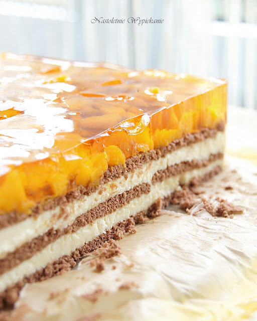 Trzy warstwy kakaowych herbatników przełożonych masą serową, tzw. gotowanym sernikiem. Na wierzchu kawałki brzoskwiń zatopionych w galaretce (również brzoskwiniowej). Jest to ciasto bez pieczenia, dlatego nie pozo[…]
