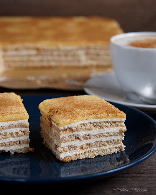 Przepis na to ciacho przywiozłam prosto z Portugalii (podaję go z drobnymi zmianami). Jest to ciasto bez pieczenia, na herbatnikach mocno nasączonych kawą, przekładanych ubitą słodką kremówką usztywnioną żelatyną.[…]