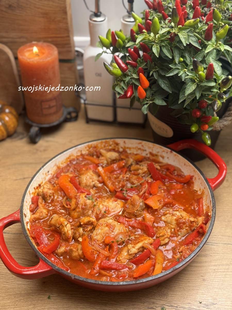 Prosty przepis na paprykowo -pomidorowego kurczaka, robi się bardzo szybko. Podaję je zazwyczaj z ryżem lub kaszą bulgur.