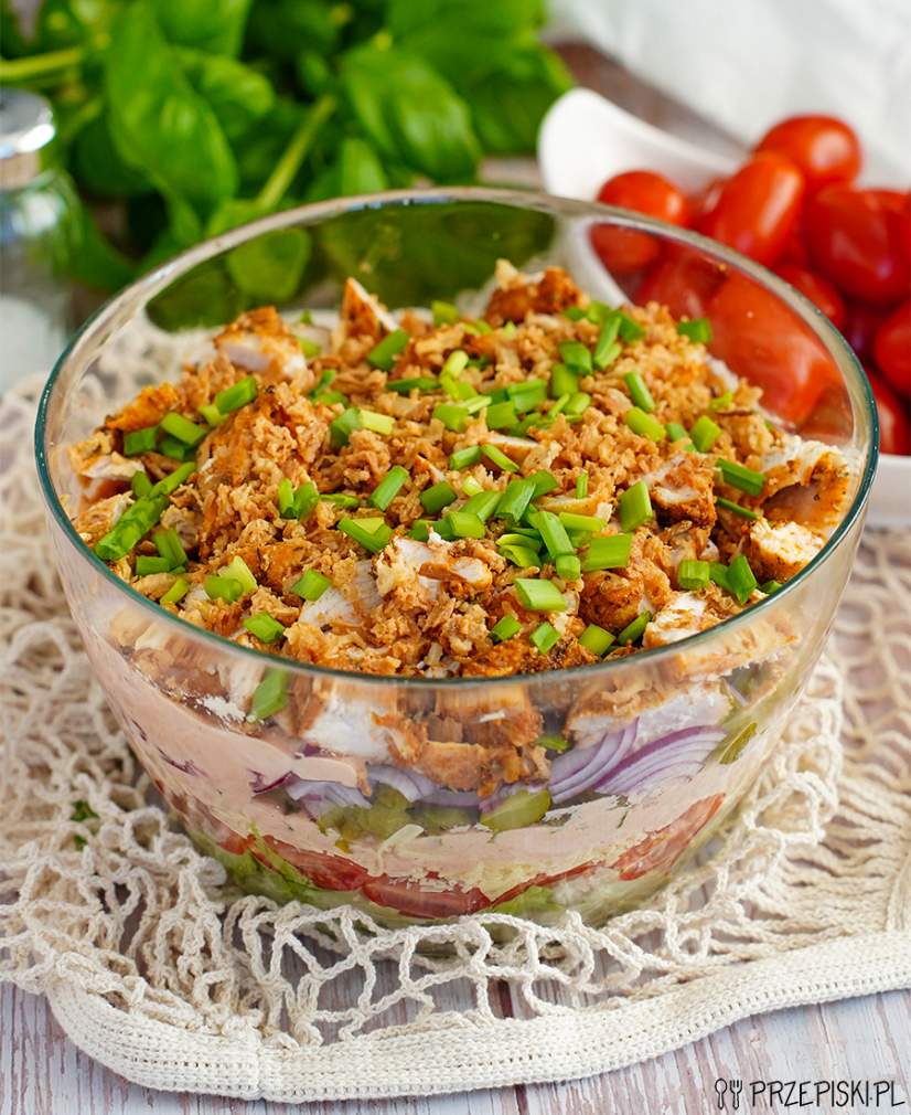 Sałatka z kurczakiem i prażoną cebulką to warstwowa sałatka, która nie tylko pięknie prezentuje się na stole, ale także rewelacyjnie smakuje.