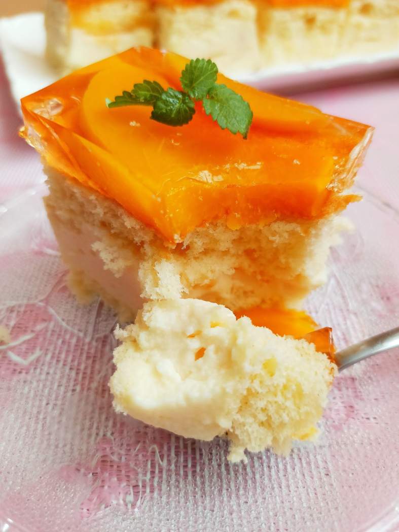 Pyszne, lekkie ciasto na biszkopcie z aksamitną pianką kisielową, brzoskwiniami i galaretką. Polecam. 🙂