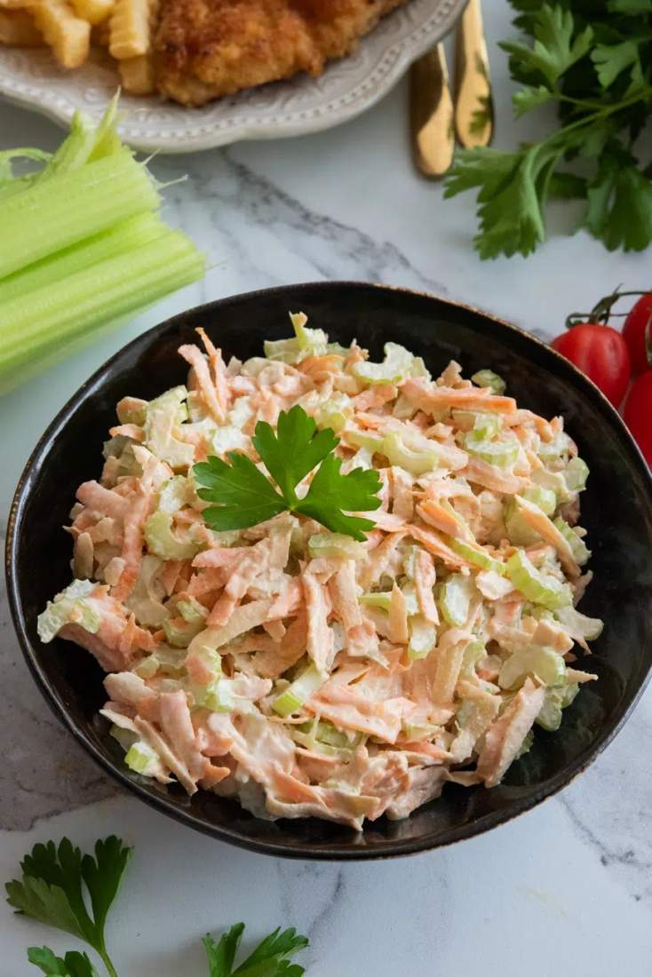 Surówka z selera naciowego do bardzo smaczny, ekspresowy dodatek do obiadu. Jest bardzo uniwersalna. Pasuje do do wielu mięs, zarówno smażonych, jak i pieczonych, duszonych w sosie. Zrobisz ją raz, dwa.