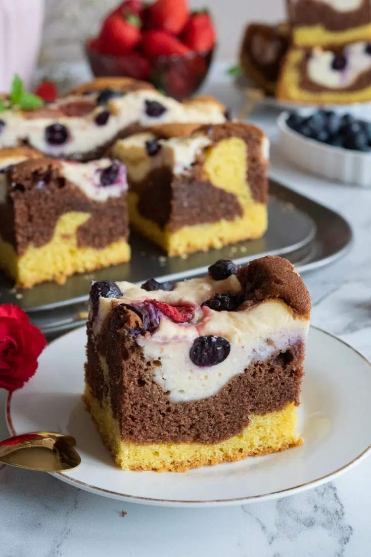 Łaciaty ucieraniec z serem i owocami to bardzo smaczny, efektowny wypiek. To taka popularna babka marmurkowa, ale z serowym i owocowym twistem. Całość smakuje naprawdę świetnie. Jestem pewna, że przypadnie Ci do gustu.