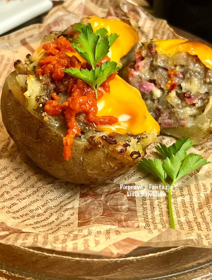 Pieprzyć z Fantazją dodał(a) nowy wpis, Pieczone ziemniaki faszerowane boczkiem, kiełbasą i pieczarkami – prosty obiad z ajvarem 1 miesiąc, 2 tygodnie temu