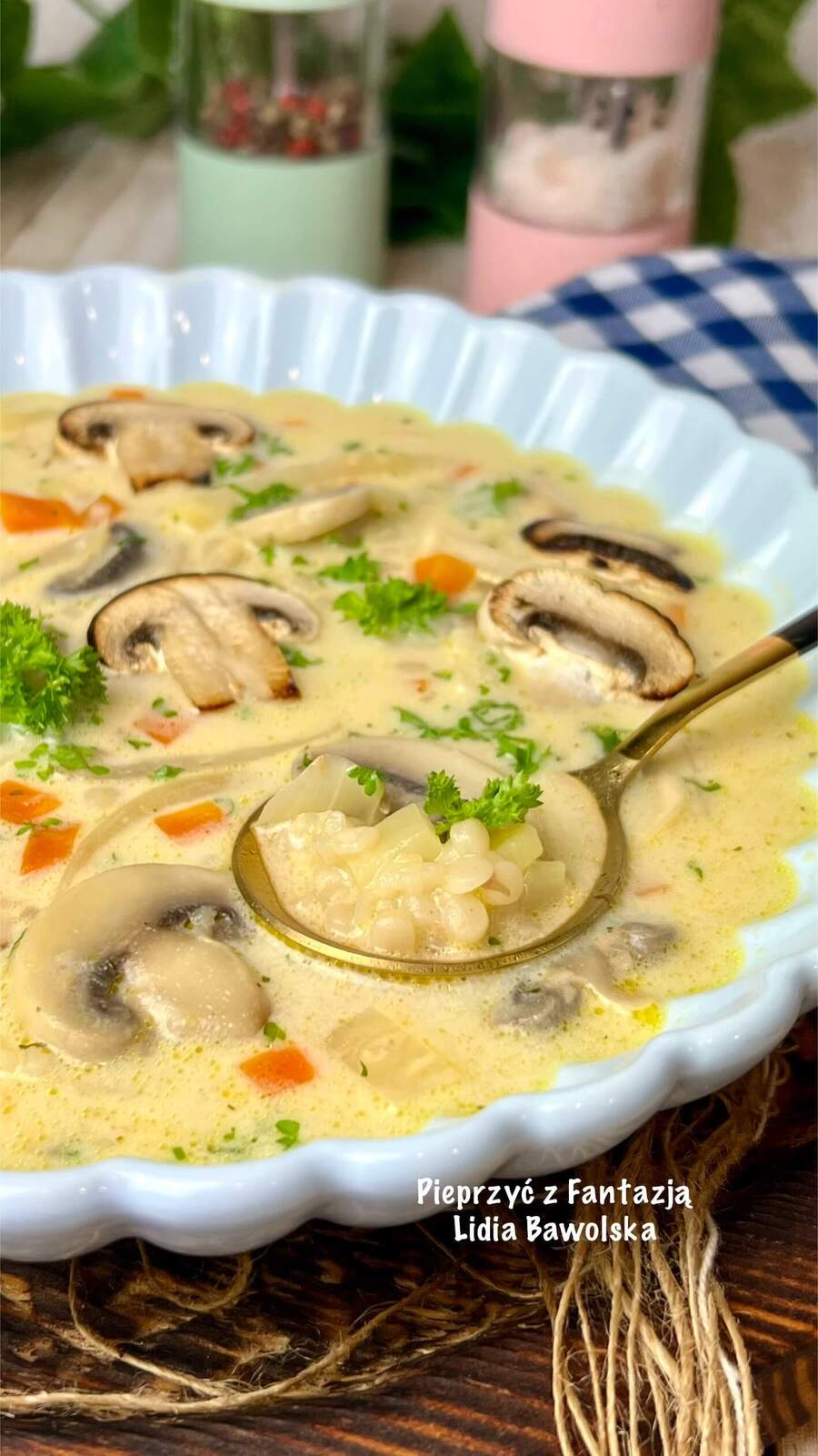 Pieprzyć z Fantazją dodał(a) nowy wpis, Zupa pieczarkowa z kuskusem perłowym i serkiem kurkowym – delikatna i kremowa 1 miesiąc, 2 tygodnie temu