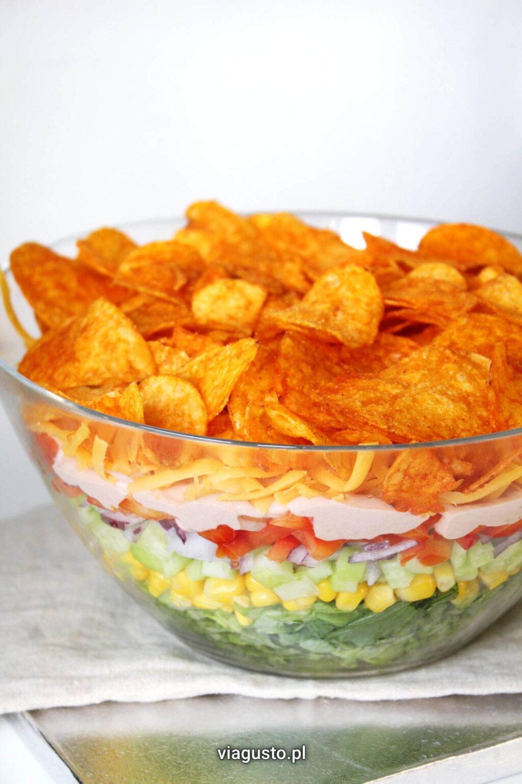 Kolorowa i bardzo szybka w przygotowaniu sałatka z chipsami paprykowymi. Zobacz przepis na tę prostą sałatkę na każdą okazję!