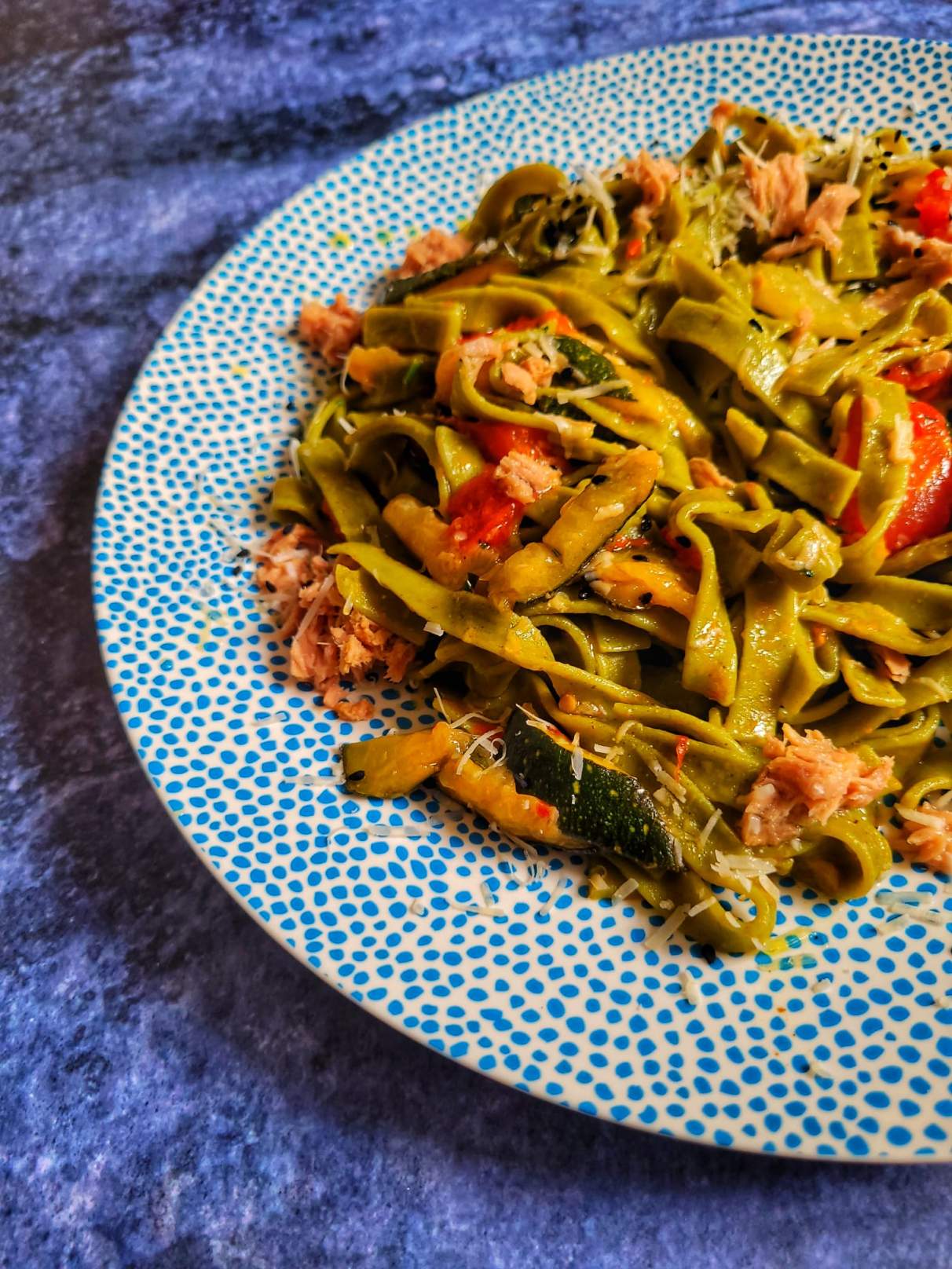 Tagliatelle z cukinią, pomidorem i tuńczykiem.